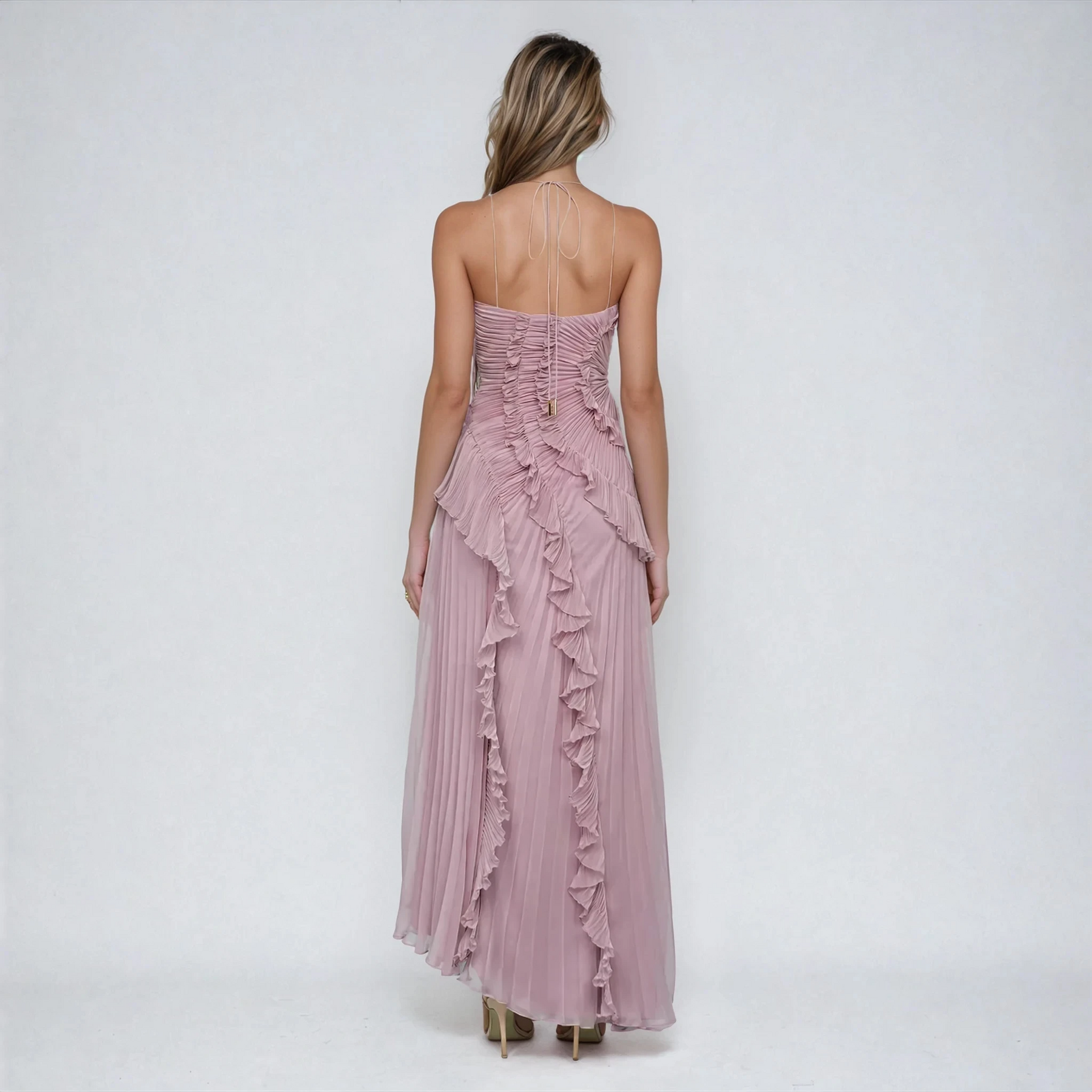 Refined Details: The tied halter neck adds a timeless touch of elegance.