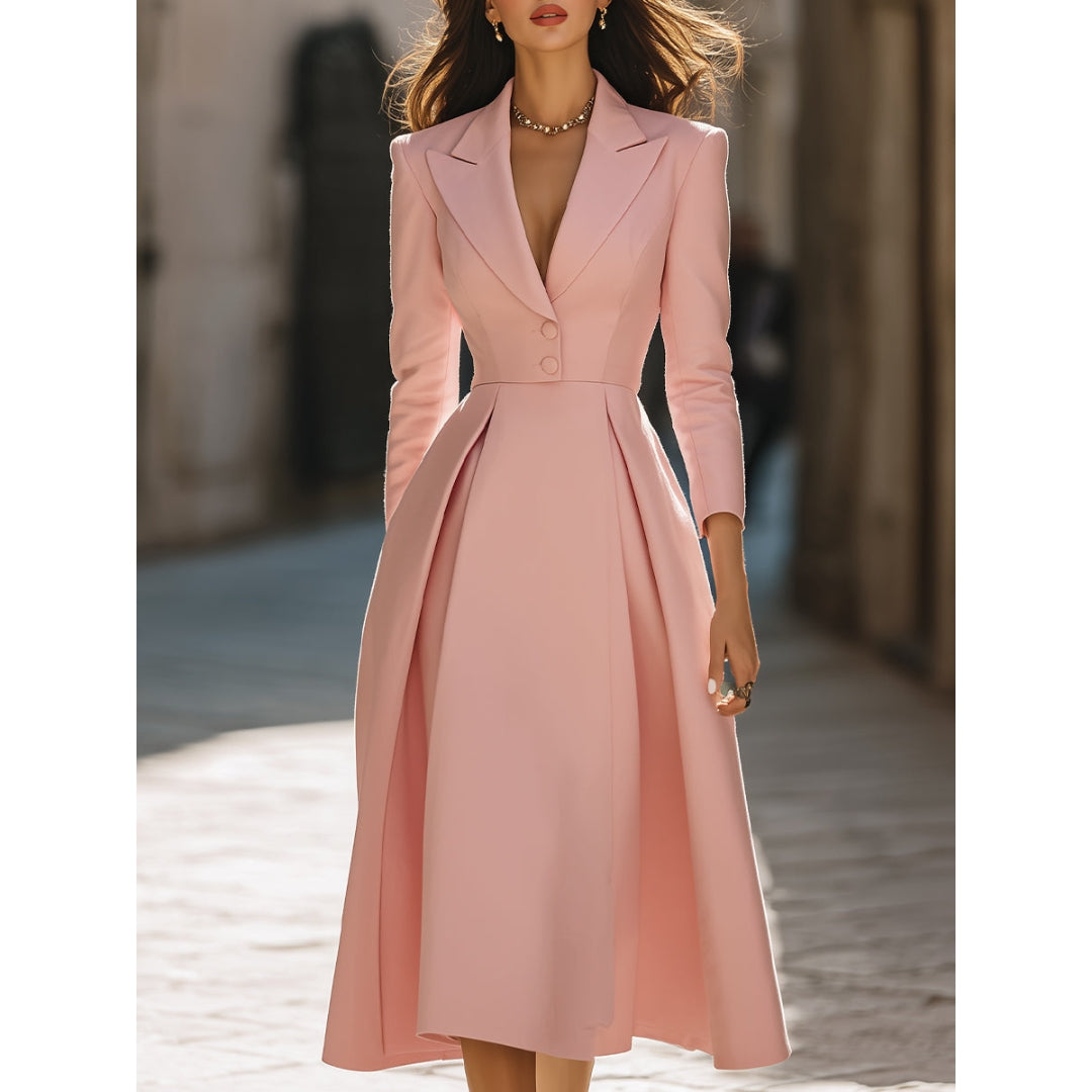 The Emily Pleated Blazer Midi Dress combines refined tailoring with feminine grace. Designed in a soft blush tone, this dress features a structured blazer-style bodice with a notched collar, pleated midi skirt, and long sleeves for a polished, timeless silhouette. Perfect for brunch dates, events, or elegant office wear, it exudes sophistication with a touch of effortless charm.